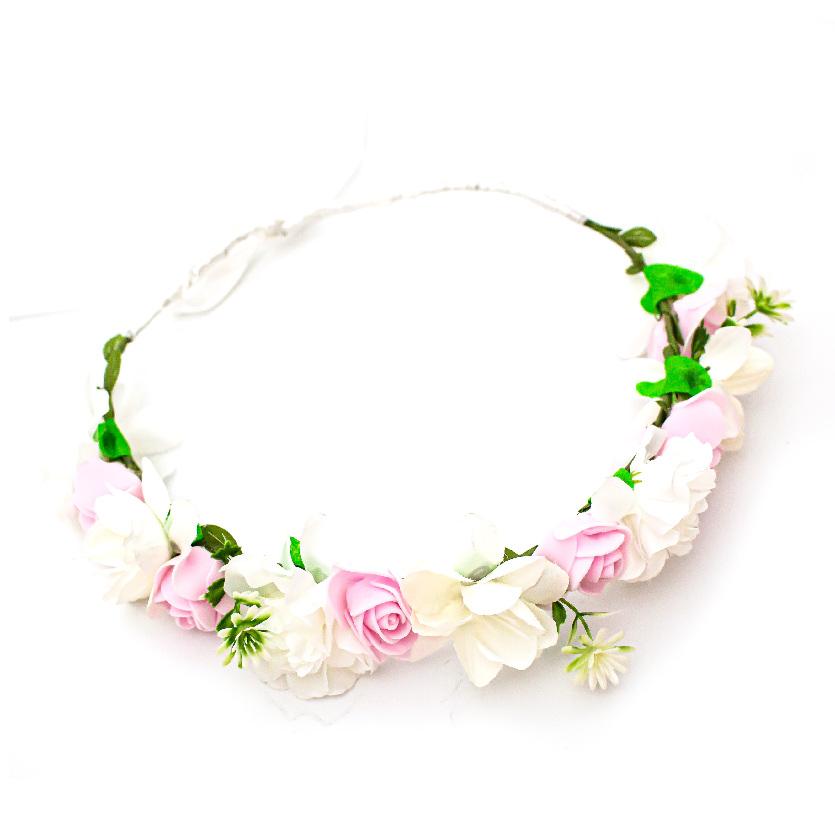 Delikatny, ręcznie wykonany wianek z kwiatów w odcieniach bieli i pastelowego różu to idealny dodatek do romantycznych stylizacji. Kompozycja składa się z realistycznych, sztucznych kwiatów – róż, hortensji i drobnych białych akcentów, przeplecionych subtelną zielenią. Całość zamocowana jest na elastycznym, oplatanym druciku, zakończonym regulowaną, białą wstążką, dzięki czemu wianek idealnie dopasowuje się do każdej głowy.