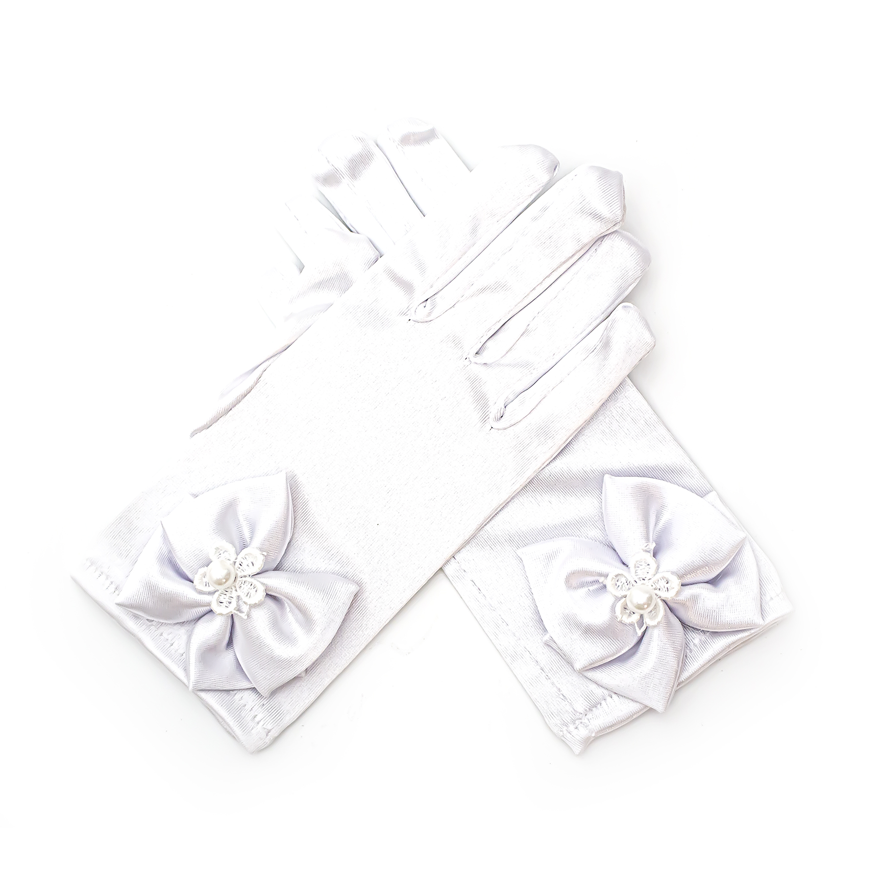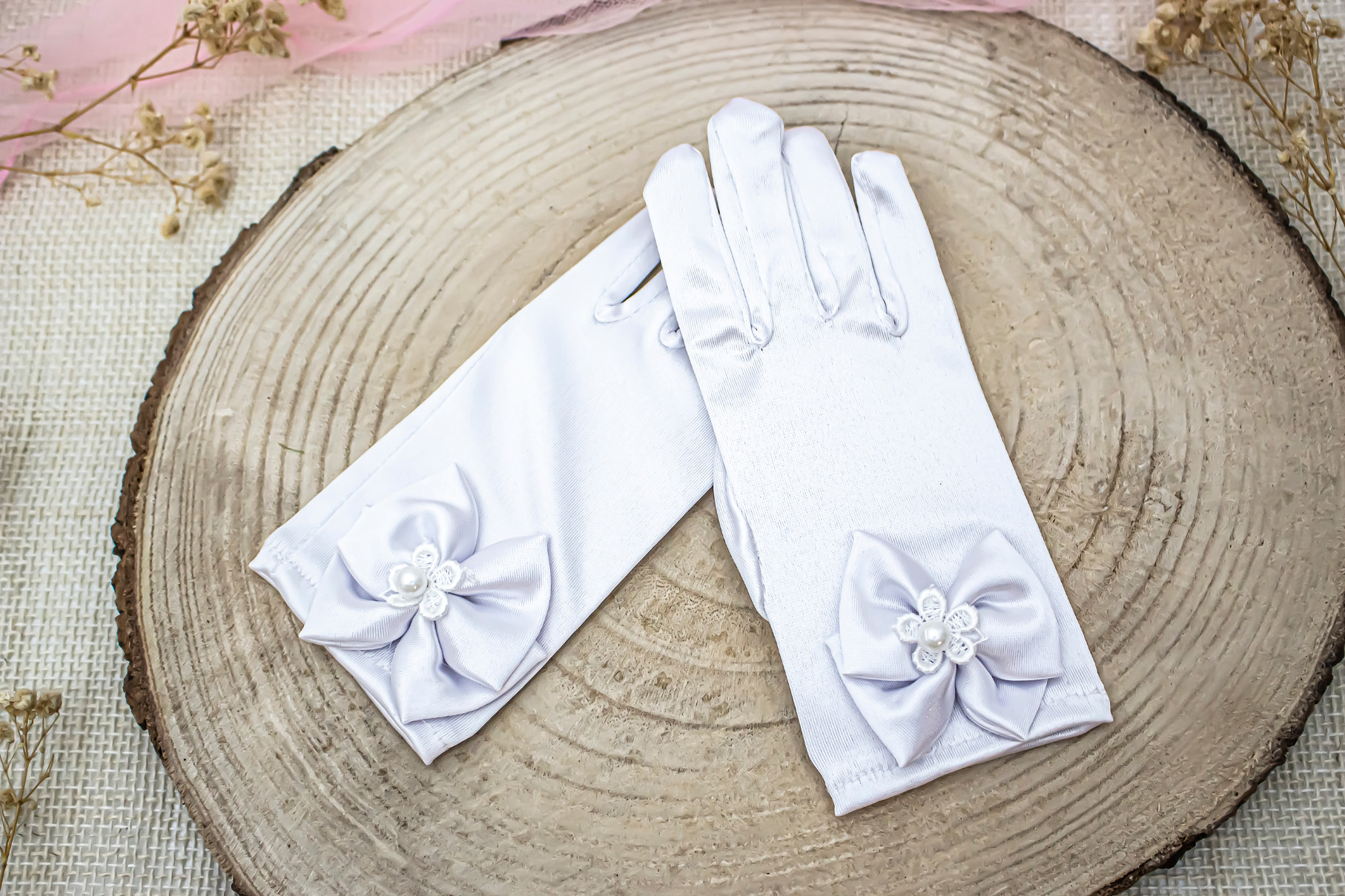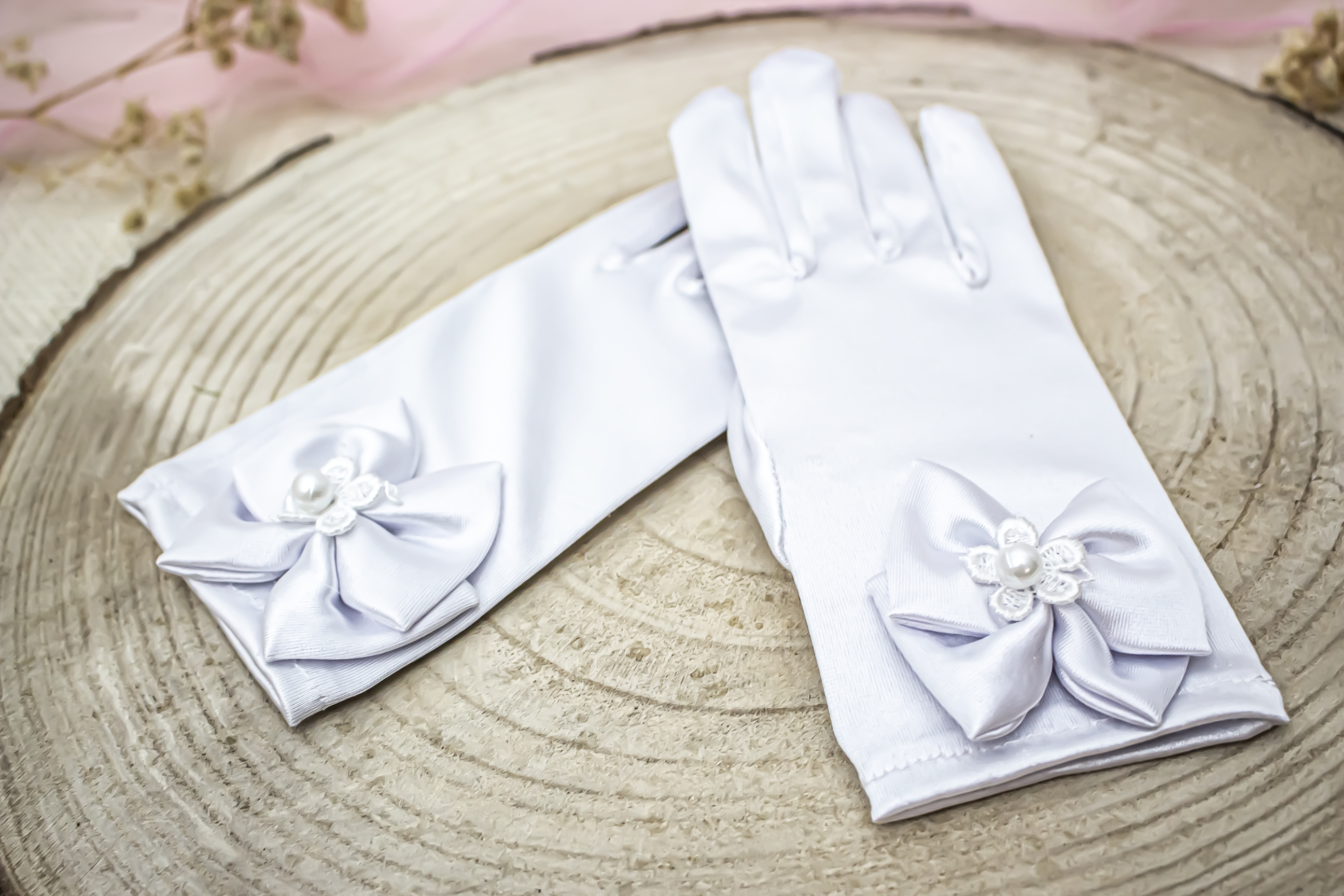 Urocze, białe rękawiczki dla dziewczynki, idealne na Pierwszą Komunię Świętą i inne uroczystości. Wykonane z gładkiego, satynowego materiału, ozdobione subtelną kokardką z perełkami. Dodadzą elegancji każdej stylizacji.