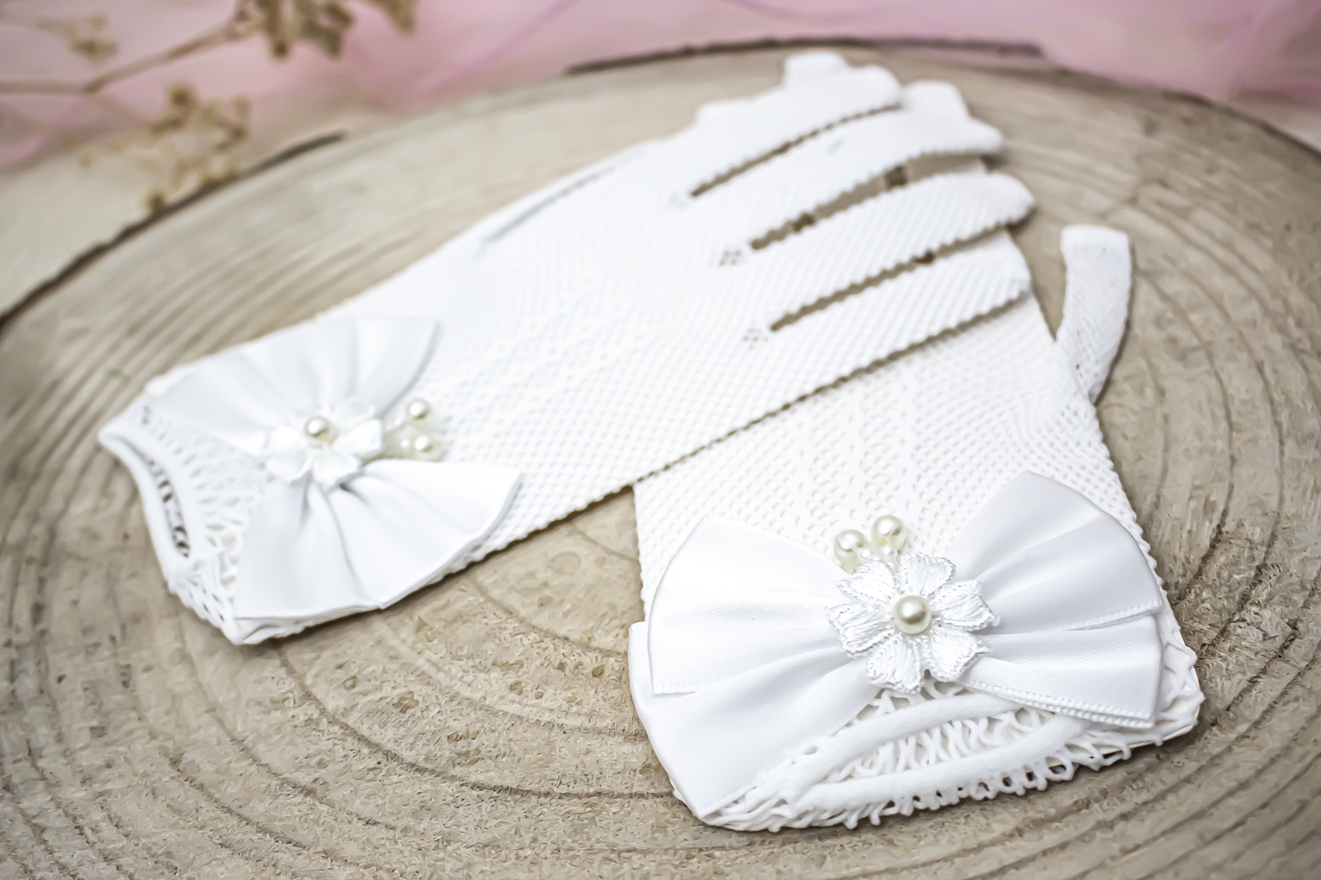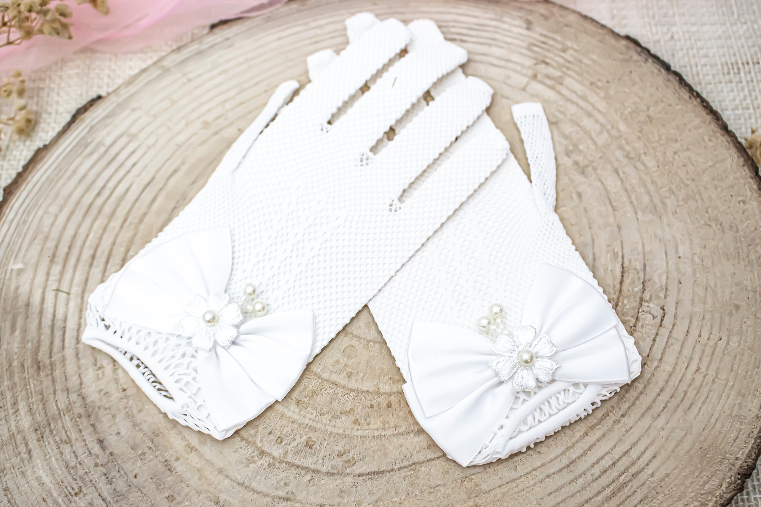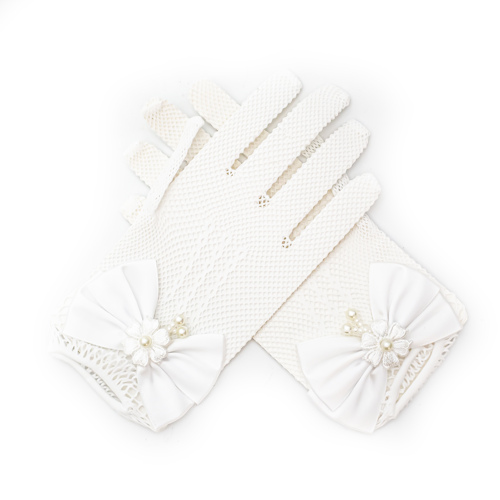 Urocze, białe rękawiczki dla dziewczynki, idealne na Pierwszą Komunię Świętą i inne uroczystości. Wykonane z delikatnej koronki, ozdobione subtelną kokardką z perełkami. Dodadzą elegancji każdej stylizacji.