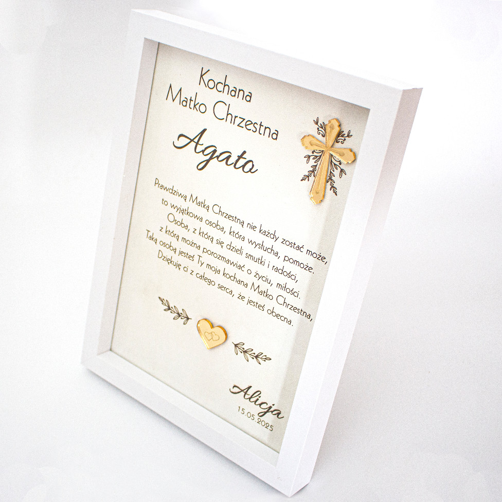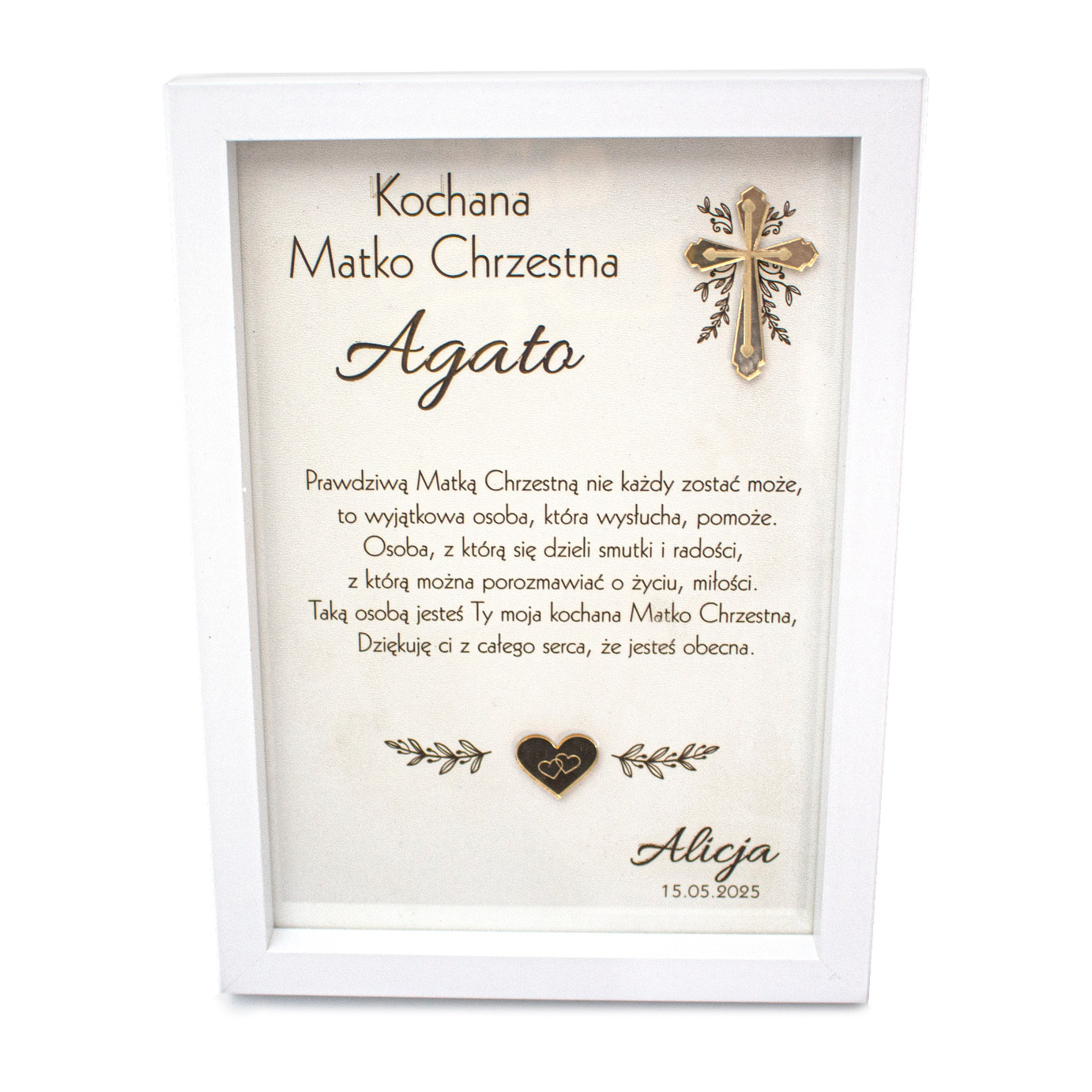 Elegancka, personalizowana ramka z dedykacją dla Matki Chrzestnej , Ojca Chrzestnego Ramka ma białą obudowę i zawiera ozdobny grawer na jasnym tle.