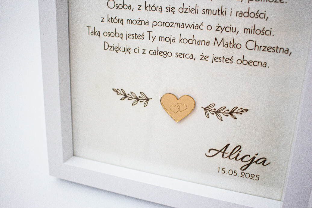 Elementy dekoracyjne obejmują złoty krzyż w górnej części oraz serce z motywem dwóch splecionych serc na dole, otoczone delikatnymi gałązkami. Personalizacja obejmuje imię Matki Chrzestnej lub Ojca Chrzestnego oraz podpis osoby składającej podziękowanie ( np. Alicja) wraz z datą ( np.15.05.2025).