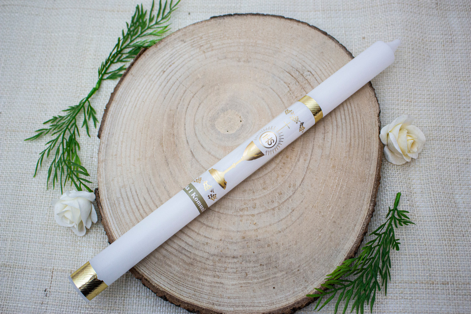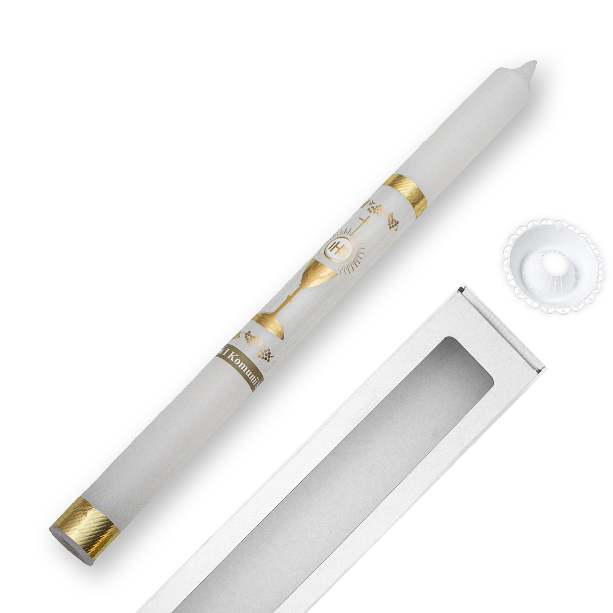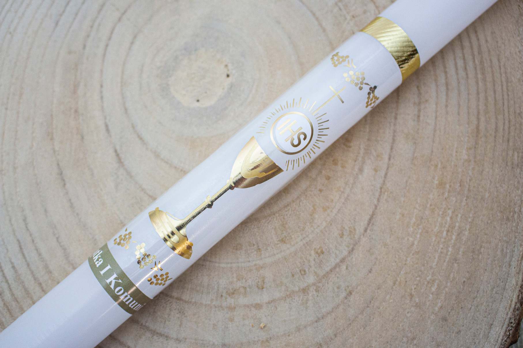 Elegancka świeca komunijna, ręcznie zdobiona motywem kielicha oraz Hostii, utrzymana w klasycznej biało-złotej kolorystyce. Jej uniwersalny design sprawia, że doskonale sprawdzi się jako pamiątka Pierwszej Komunii Świętej zarówno dla chłopca, jak i dziewczynki.