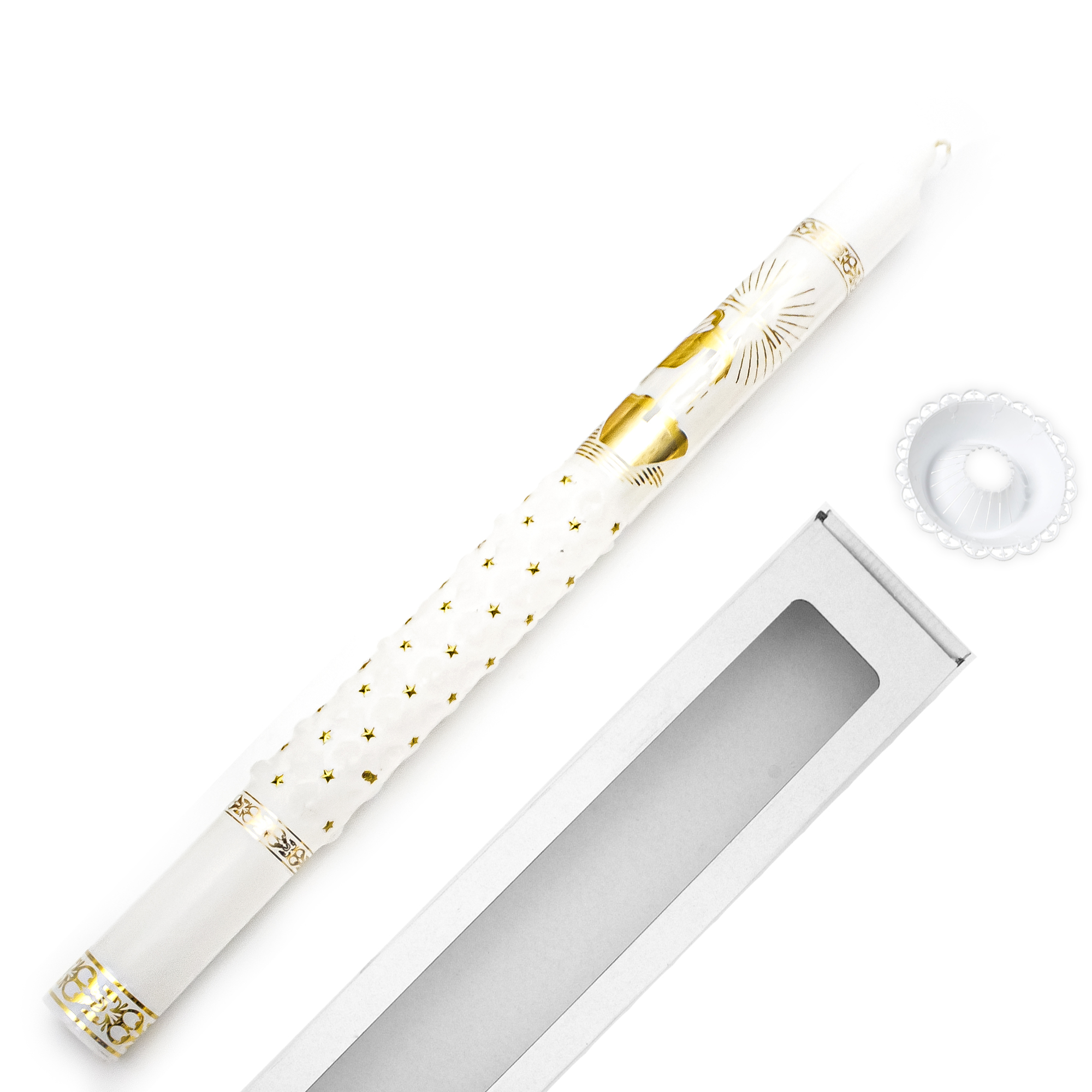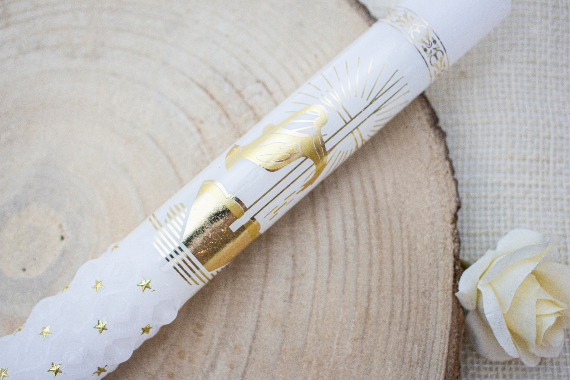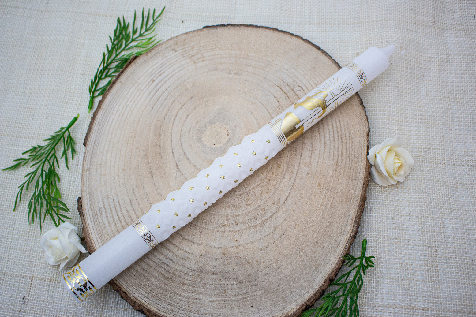 Elegancka świeca do Chrztu lub Komunii Świętej , ręcznie zdobiona w biało-złotej kolorystyce. Jej uniwersalny design sprawia, że doskonale sprawdzi się jako pamiątka zarówno dla chłopca, jak i dziewczynki.